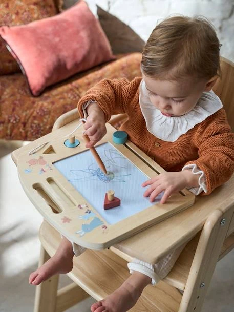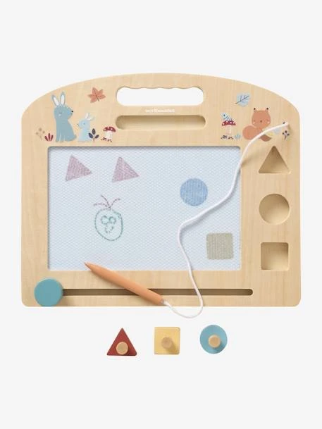 On se souvient tous du plaisir à dessiner avec une ardoise magique ! La voici dans une version revisitée en bois, avec son stylet et ses 3 formes à tamponner. L’enfant dessine ou tamponne une forme sur l’ardoise, puis efface son oeuvre en faisant glisser la petite poignée en bas de l’ardoise… Vraiment magique !