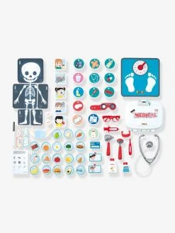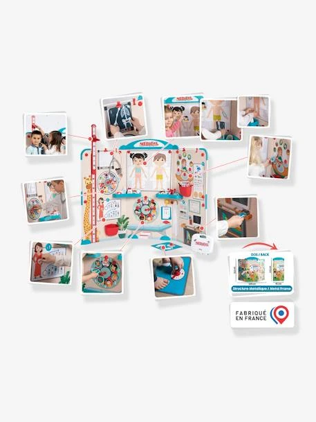 - De nombreuses fonctions liées à l’univers de la médecine sont reprises : coin radiologie, reconnaissance des parties du corps, partie nutrition, échelle optométrique, horloge des bobos, échelle de croissance, toise avec équerre jusqu’à 1m20, pèse-personne factice, horloge expliquant le déroulement d’une consultation, et bien d’autres encore…