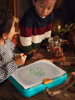 Avec DessinĂ©o, votre enfant rĂ©ussit Ă coup sĂ»r ses dessins. Il lui suffit de choisir un modèle parmi tous ceux proposĂ©s, de le placer sur la roue et de poser une feuille de papier sur le pupitre lumineux. Etape par Ă©tape, il commence Ă dessiner les silhouettes d’animaux ou de personnages, puis tourne le support du disque modèle afin de faire Ă©voluer l’illustration et les dĂ©tails, jusqu’Ă obtenir l’image finalisĂ©e. Ce pupitre permet un apprentissage facile du dessin et peut ĂŞtre facilement transportĂ© grâce Ă sa poignĂ©e.