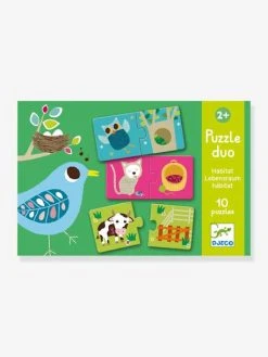 Qui vit oĂą? La poule avec le poulailler, la grenouille dans la mare, le chat dans son panier… Votre bout de chou  va devoir associer l’animal avec son habitat pour rĂ©aliser 10 puzzles.