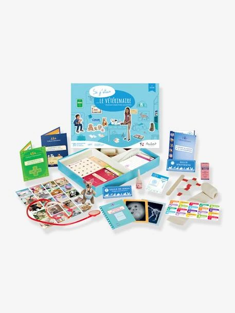 - Plus de 50 accessoires miniatures : stéthoscope (qui fonctionne réellement), plaque professionnelle, dossiers médicaux à personnaliser avec les photos d’animaux fournis, bloc d’ordonnances, vignettes vaccins à coller sur les carnets de santé, radios et analyses, bandages pour les pattes blessées, seringue pour vacciner les nounours, abaisse-langue, livre de rendez-vous…